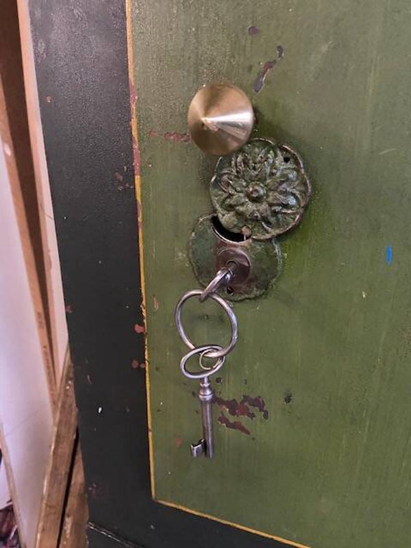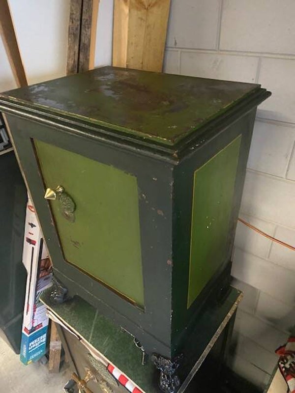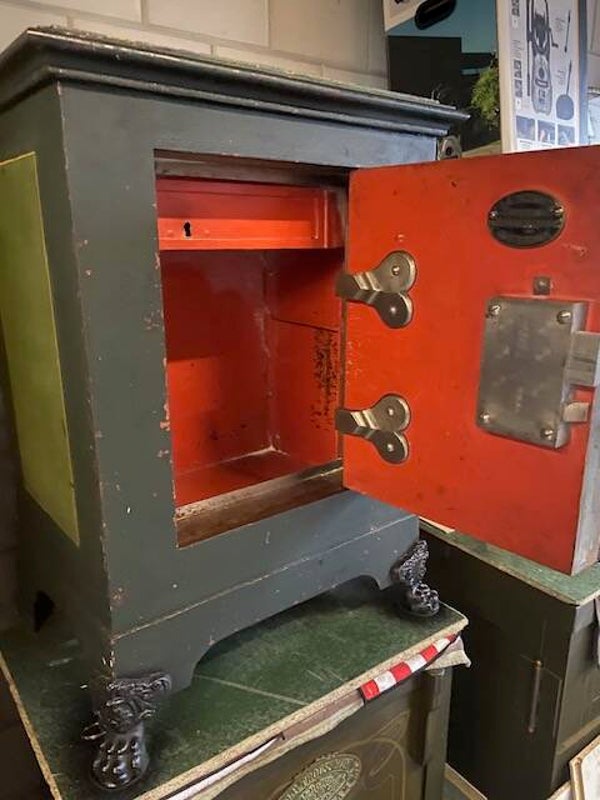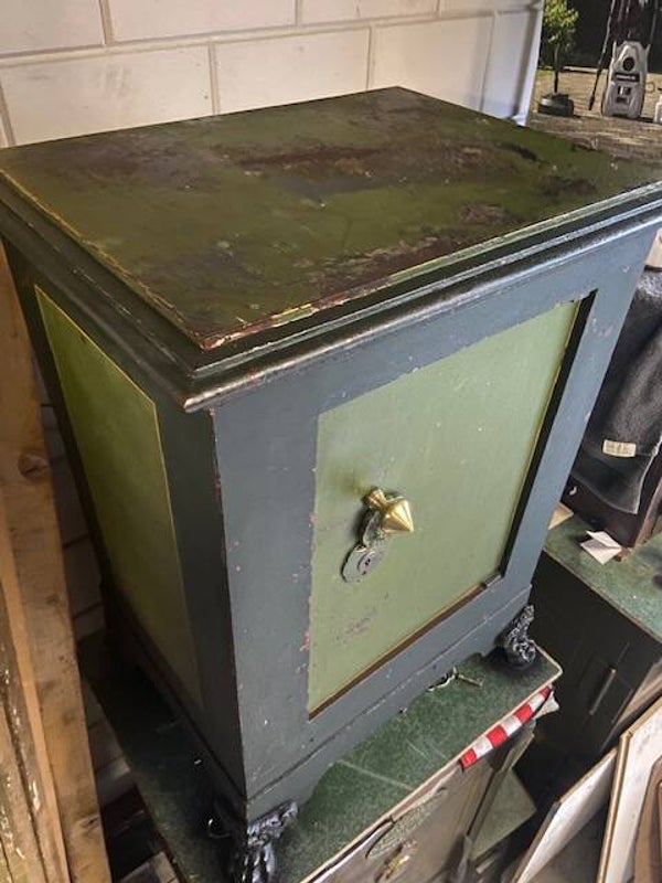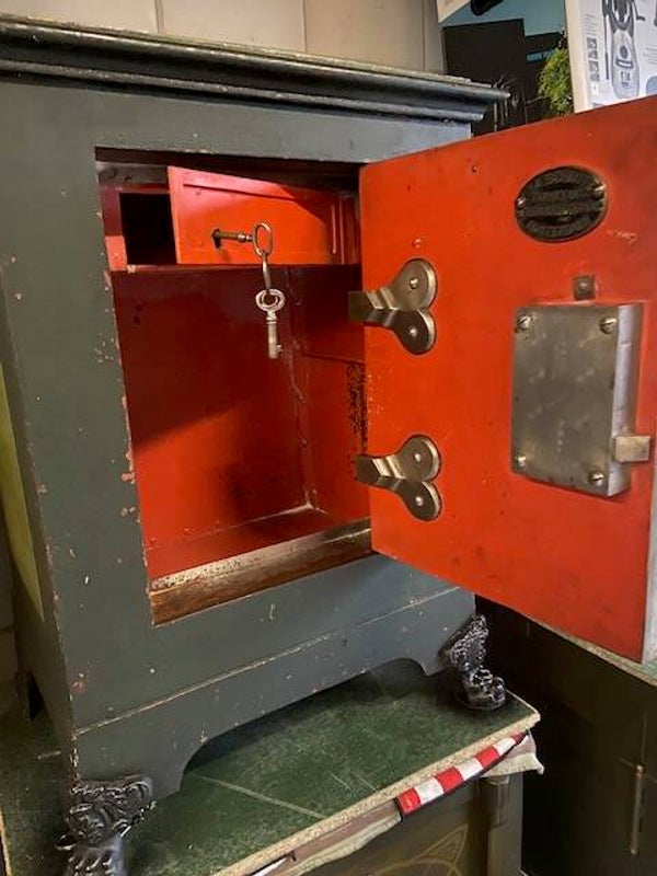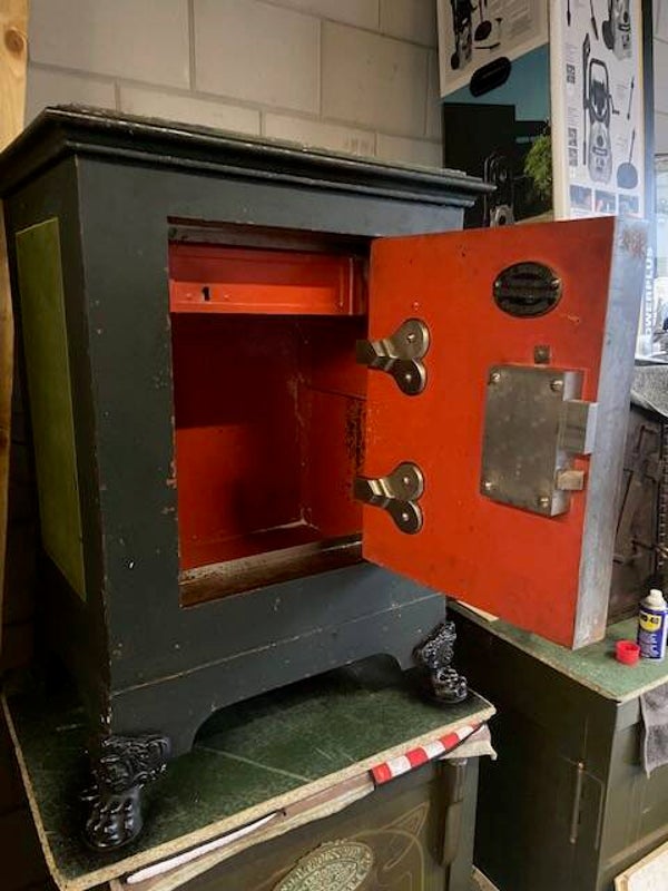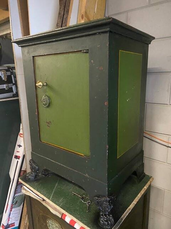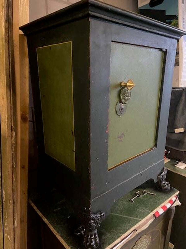 Antieke middelgrote kluis uit Amsterdam eind 19e eeuw van J.A.SCHMITZ uit de Utr Dwarsstraat. Kluis is compleet met hoofdsleutel en binnenkluis sleutel. Mooi middelgroot exemplaar in originele staat met mooie leeuwenpootjes.