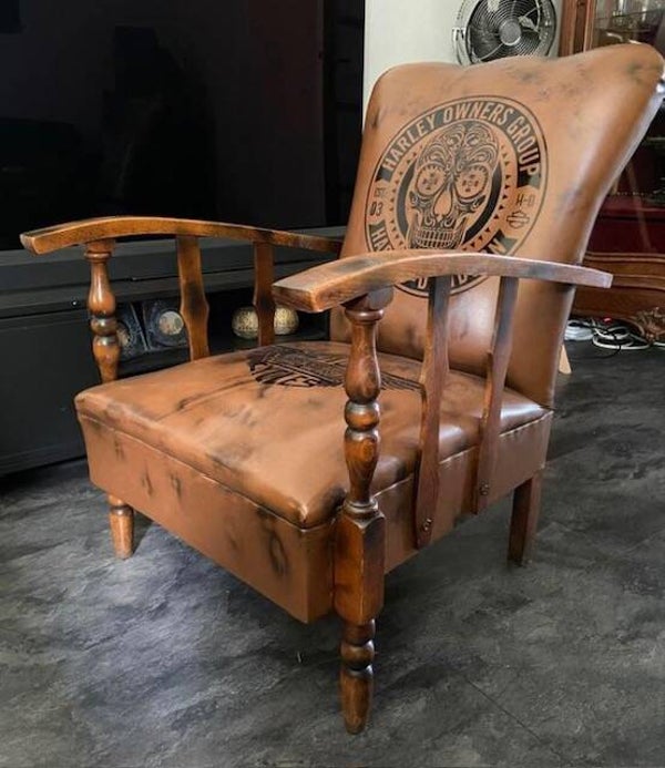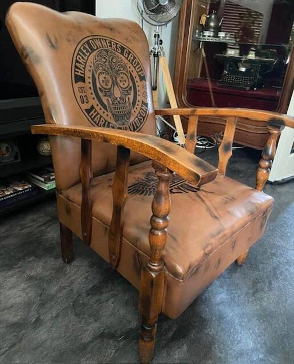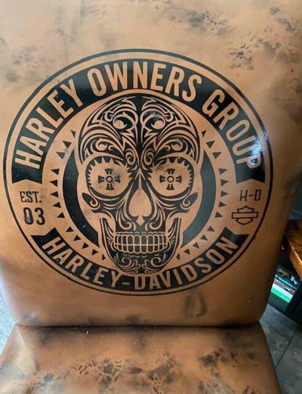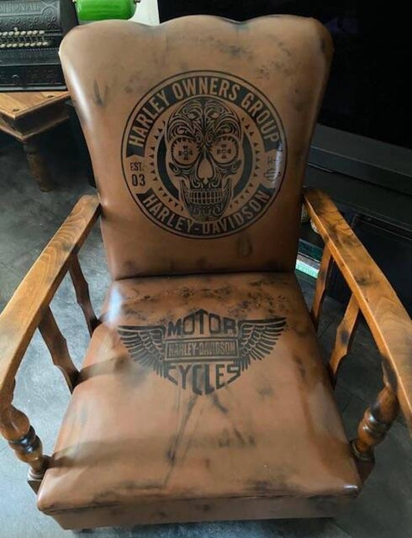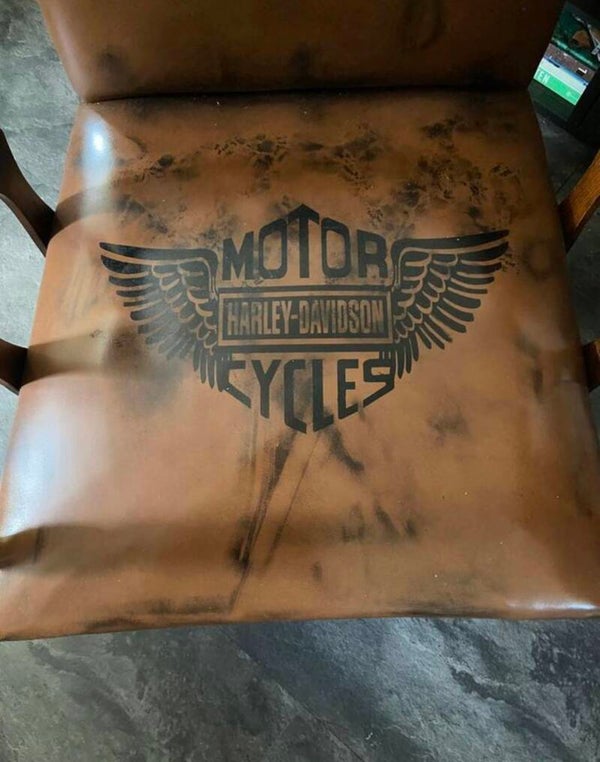 Leuke Harley Davidson stoel voor thuis of in de mancaveZithoogte 37 cmBreed 54 cmDiep 52 cmHoog 86 cmSkai uitvoering met zwarte emblemen